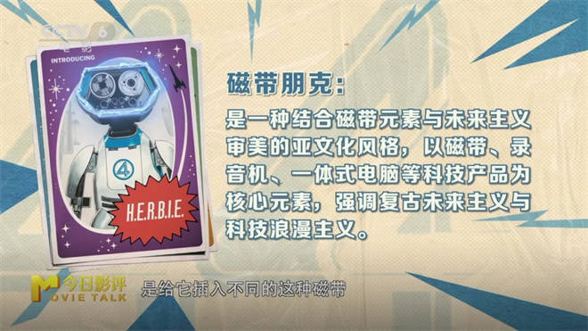 *媒介与科技的怀旧运用:神奇先生主持的科普节目在显像管电视上播放,带有老旧ABC台标;机器人通过插入磁带切换功能,融入“磁带朋克”元素。