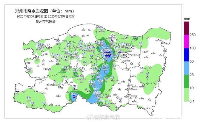 2025年8月7日8时至12时,郑州市大部分区、县出现阵雨、雷阵雨,雨量分布不均。其中,主城区、新密、登封局部出现短时暴雨。最大降水量出现在主城区中原区站73.1毫米,最大小时雨强位于郑州市政府站64.1毫米。降水量在50.0-99.9毫米的站点有7个,25.0-49.9毫米的站点有10个,10.0-24.9毫米的站点有11个,0.1-9.9毫米的站点有78个。