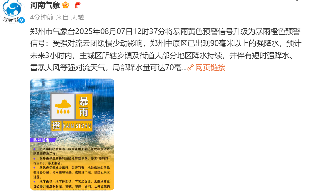 此前,郑州市气象台于8月7日12时37分将暴雨黄色预警信号升级为暴雨橙色预警信号:受强对流云团缓慢少动影响,郑州中原区已出现90毫米以上的强降水,预计未来3小时内,主城区所辖乡镇及街道大部分地区降水持续,并伴有短时强降水、雷暴大风等强对流天气,局部降水量可达70毫米以上,个别站点将超过100毫米。